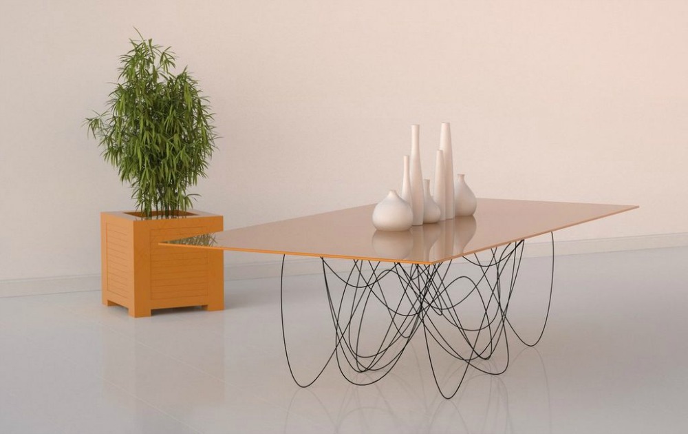 Ovaj dizajnerski komad nemeštaja dizajnera Jason Phillips iz Severne Karoline krasi jednostavna i ravna površina stola napravljena od komada drveta i neuobičajenih nožica. Svi koji misle da je ovaj sto nestabilan, nisu u pravu. Nogice su napravljene od čvrste čelične žice, koja je prekrivena crnim lakom.