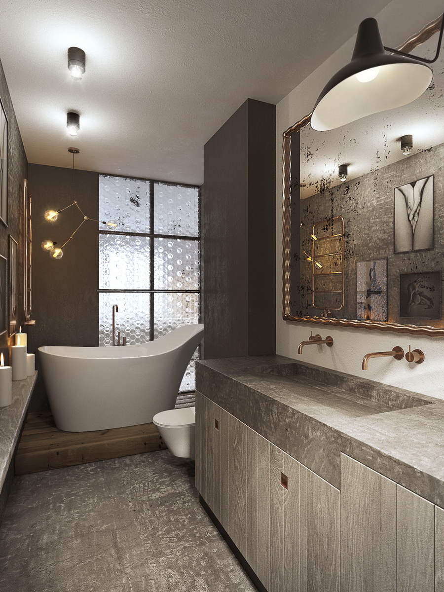 Kao kontrast i ravnotežu hladnim podovima od betona, dizajnerka je upotrebila prirodno drvo tamnijih nijansi.