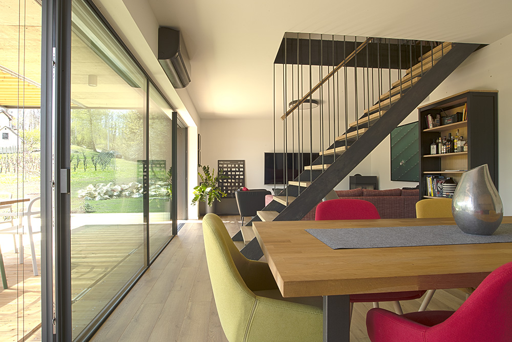 Enterijer je podeljen na dnevnu zonu u prizemlju i noćnu pod kosinama krova. Prizemlje deli stepenište od kovanog gvožđa sa gazištima od hrastovine. Na taj način open space dobija dva segmenta - kuhinju sa trpezarijskim stolom i dnevni boravak.