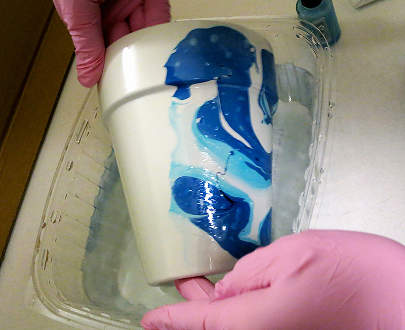 Korak 4: Počnite od jednog kraja i spustite saksiju u posudu. Lak koji se razlio na površini vode prilepiće se za nju brzo. Nastavite postupak rotirajući saksiju kako bi ofarbali svaki njen deo.